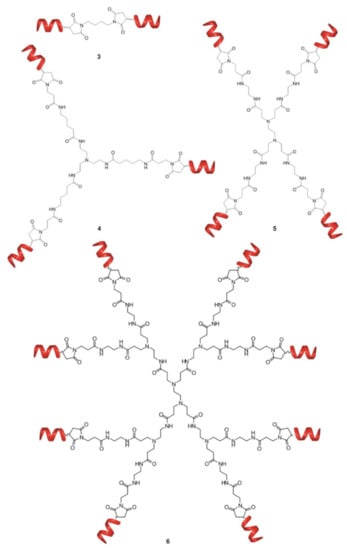 Notably, the dendritic structure offers tremendous opportunities for controllable modification and modulation of the activity by fine tuning the topology and structure of the molecule. In [160], the authors investigated the influence of the dendrimer branching degree and the chemistry of terminal groups on the ability to interfere with the formation of toxic Aβ oligomers. The results showed that multivalency is crucial for effectively decreasing Aβ oligomers toxicity. For the goal, the di-, tri-, tetra and octa-valent peptide dendritic structures were explored (Figure 7). The association constants measured by ITC demonstrated a clear correlation between binding affinity and valent properties up to tetravalent compounds. Surprisingly, an increase in the number of arms up to eight did not further enhance the affinity of binding, confirming the previous findings that a balance between dendrimer size, charge and charge density is required for effective complexation with protein. The variation of topology from linear to focal symmetry within tetravalent compounds revealed the higher binding affinity for dendritic symmetric compounds. The influence of dendrimer chemistry, i.e., the functional groups, on binding affinity was also assessed through evaluation of thermodynamic parameters obtained by ITC. Replacement of functional groups results in distinct physicochemical properties associated with different binding affinities. Finally, the ability of the selected compounds to decrease the toxicity of Aβ oligomers was studied on hippocampal slices by MTT assay. The results showed a perfect correlation between the binding affinities and biological activity. Similarly, to ITC results, the tetrameric dendrimer was the most efficient in protection against Aβ-induced toxicity, while the octavalent compound did not possess better activity. These outcomes demonstrate that biological activity of the compounds can be predictable from binding data and the dendritic structures are the most potent compounds for the purpose.