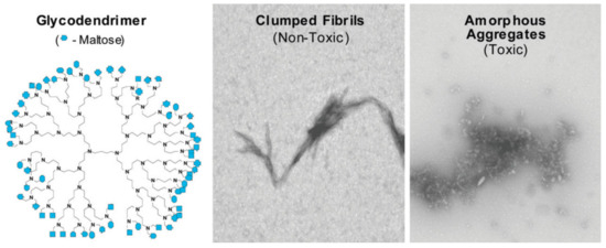 The hydrophobic forces significantly contribute to high association constants, which, in turn, influence the ability of dendrimers to induce the conformational changes in protein. In fact, in [157], the authors established the ability to suppress the amyloid aggregation as a result of conformational changes in Aβ42 structure induced by dendrimers. The modification of PPI dendrimers with maltose (Mal) moieties also influenced mechanism of antiamyloid action. While unmodified PPI dendrimers most likely inhibit the aggregation due to binding with monomeric or oligomeric peptide and blocking the fibril growth, PPI-G4-Mal prevent the fibrillation of Aβ42 by shifting the aggregation process to the formation of granular nonfibrillar amorphous aggregates of low toxicity [157]. However, the interaction was generation-dependent: PPI-G5-Mal generated granular nonfibrillar amorphous aggregates, whereas PPI-G4-Mal provided clumped fibrils at low dendrimer−peptide ratios and amorphous aggregates at high ratios (Figure 9). Interestingly, the clumped fibrils were non-toxic for PC12 and SH-SY5Y cell lines, whereas amorphous aggregates demonstrated toxicity. The difference in inhibition pathways was explained by the maltose surface density, which was clearly higher in the case of PPI-G5-Mal. The authors supposed that higher maltose surface density ensures more preferable hydrogen bonding between PPI dendrimers and peptides.