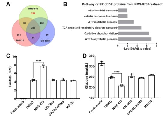 Only NMS-873 promotes glycolysis and inhibits oxidative phosphorylation. (A,B) Using TMT-based quantitative proteomics to distinguish the unique pathway of NMS-873 [30]. Venn diagram of DE proteins identified from HCT116 cells at 6 h-treatment with MG132, CB-5083, and NMS-873. DE proteins were defined as treatment vs. DMSO control, p < 0.05; n = 2 (A). The representative KEGG pathway or GO biological process from a functional enrichment analysis of the 219 DE proteins identified only in the NMS-873 treatment group (B). (C,D) Lactate (C) and glucose (D) concentration in the cultured medium were measured after 6 h incubation with DMSO, 4 μM NMS-873, 4 μM CB-5083, 4 μM UPCDC-30245, or 1 μM MG132. Statistical analyses were carried out by non-paired one-way ANOVA (treatment vs. DMSO) using Prism 8. p-values are shown as **** p < 0.0001. All of the data from (C,D) are presented as mean ± SD from triplicate experiments.