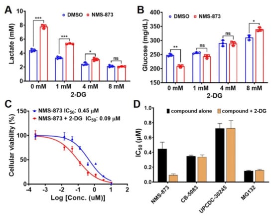 Synergistic anti-proliferative effect of 2-DG and NMS-873 in HCT116. (A,B) 2-DG inhibited NMS-873-induced glycolysis. Lactate production (A) and glucose concentration (B) were measured in the medium of HCT116 cells after different concentrations of 2-DG co-cultured with DMSO or 4 μM NMS-873 for 6 h. Data are presented as mean ± SD from triplicate experiments. Statistical analyses were carried out by multiple t-tests (NMS-873 vs. DMSO) using Prism 8. p-values are shown as * p < 0.05, ** p < 0.01, *** p < 0.001 and ns stands for non-significant difference. (C,D) Anti-proliferation activities of the compound alone treated and co-treated with 1 mM 2-DG against HCT116 cells after 48 h treatment. The cell viability of 1 mM 2-DG was ~73% compared with DMSO (Figure S3C, Supplementary Materials). The IC50 of compounds in co-treatment was calculated by normalizing to the single treatment of 1 mM 2-DG. Data are presented as mean ± SD from quadruplicate experiments.