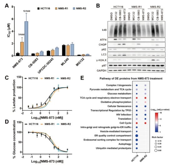 In this study, we established NMS-873-induced resistant cell lines harboring the A530T mutant of p97 (Figure S2B, Supplementary Materials), which has been reported to cause a five-fold decrease in the p97 inhibition potency of NMS-873 [56]. We used a cell viability assay that confirmed the anti-proliferation resistance of NMS-873 on NMS-R cell lines (Figure 3A). We also detected p97-associated biomarkers by western blot and demonstrated that NMS-873 lost p97 inhibition at 4 μM and six hours of treatment on NMS-R cells (Figure 3B and Figure S2C–E, Supplementary Materials). Furthermore, we compared cellular pathways affected by NMS-873 treatment on HCT116 and NMS-R2 by TMT-based quantitative proteomics. The functional enrichment analysis result (Figure 3E) showed that NMS-873 could not affect p97-related pathways in NMS-R2 but still could affect glycometabolism-associated functions. This indicates that NMS-873 leads to dysfunctional glycometabolism by means that are independent of p97. The enrichment data also showed that NMS-873 affects some other pathways in HCT116 and NMS-R2, suggesting that NMS-873 may also affect these cellular functions through p97-independent manners. We compared medium lactate and glucose concentrations of HCT116 and NMS-R lines to confirm the independent dysfunctional glycometabolism effect. All the three cell lines showed similar dose-dependent lactate increasing and glucose decreasing by NMS-873 treatment, and the IC50s are ~10 nM (Figure 3C,D). A previous study reported that NMS-873 inhibits complex I with an IC50 of 1.3 μM in L939 normal fibroblast cells [18], 100 times higher than our result in HCT116 colon cancer cells. This observation indicates that NMS-873 may work more efficiently to inhibit oxidative phosphorylation on tumor cells.