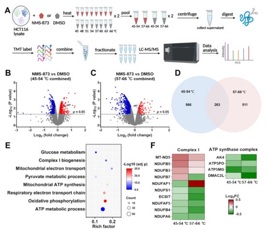 HCT116 cells were harvested from one 80% confluent 15 cm plate. Cell pellets were lysed with 1 mL lysis buffer (DPBS containing protease inhibitor and 0.2% DDM) and centrifuged at 16,000× g for 10 min at 4 °C. The supernatant was carefully transferred to a new tube, and protein concentration was measured with Bradford reagent. Protein concentration was diluted to 2 μg/μL with lysis buffer to reach a final concentration of 0.5% DMSO or 50 μM NMS-873, and the treated supernatants were incubated at room temperature for 30 min. Each group was then aliquoted into 2 × 8 PCR tubes (replicates) and treated at eight temperature points (45, 48, 51, 54, 57, 60, 63, and 66 °C); at each of these temperature points, the tubes were heated for three minutes using the thermal cycler (Bio-Rad) and then left at room temperature for another three minutes. Equal volumes of samples treated at 45–54 °C and 57–66 °C temperature ranges, respectively, were combined. The combinations were centrifuged at 20,000× g for 20 min at 4 °C. Protein concentration was measured with Bradford reagent; 40 μg of proteins were transferred to a new tube, and water and 5% SDS were added to get 100 μL samples containing 1% SDS. Next, 2 µL of 500 mM TCEP and 5 µL of 500 mM fresh prepared CAA were added, and samples were incubated at 95 °C for 10 min. Next, six volumes of pre-chilled acetone were added to precipitate the protein, and samples were stored at −20 °C overnight. Precipitated protein was collected by centrifuging samples at 20,000× g for 10 min at 4 °C. The dry 40 µg pellets were resuspended with 40 µL of 100 mM TEAB buffer containing 0.4 µg Lys-C (Wako Chemicals, Osaka, Japan) and 0.8 µg Trypsin (Thermo Fisher Scientific Inc.). The sample was then digested at 37 °C overnight. Peptide concentrations were determined with Quantitative Fluorometric Peptide Assay (Thermo Fisher Scientific Inc.). 15 μg of the peptide was used to prepare the mass spectrometry sample, as described earlier in the section “TMT Labeling Proteomics”. We made two sets of independent TMT labeling and mass spectrometry acquisition and analysis data by combining the two sets as experimental replicates.