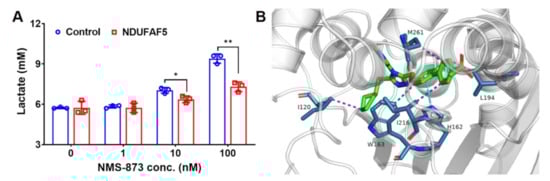 Overexpression of NDUFAF5 rescues NMS-873 induced lactate production. (A) Lactate concentrations in a medium of 293T cells were measured with or without overexpression of NDUFAF5-HA and treated with DMSO or NMS-873 for 6 h. Data are presented as mean ± SD from triplicate experiments. Statistical analyses were carried out by multiple t-tests (NDUFAF5 vs. control) using Prism 8. p-values are shown as * p < 0.05 and ** p < 0.01. (B) Docking study of NMS-873 with NDUFAF5. NMS-873 is shown as green sticks. The residues at the binding site are shown as teal sticks. The hydrophobic interaction and the π-π stacking are shown as purple and cyan dotted lines, respectively.
