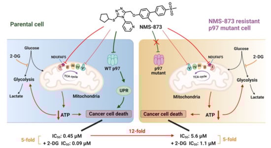 Schematic of NMS-873′s polypharmacology effects. Using chemical proteomics with parental and NMS-873 resistant HCT116 cells, we found that NMS-873 induces cancer cell death via blocking p97 (leads to UPR, green color) and mitochondrial functions (leads to decreased cellular ATP level, red color). NMS-873 induced glycometabolism dysregulation via a p97-independent manner. Using thermal proteome profiling, we discovered NMS-873 affects the stability of two mitochondria protein complexes and among them, NDUFAF5 was significantly down-regulated. Overexpression of NDUFAF5 blocks NMS-873-induced glycometabolism dysregulation and a silico docking study predicts NMS-873 can bind to NDUFAF5. Our findings lead us to propose that the polypharmacology effects of NMS-873 targeting both p97 and NDUFAF5 explains why there is only a 12-fold increase in IC50 for anti-proliferative activity in NMS-873-resistant p97 mutant cancer cells (CB-5083-resistant p97 mutant cancer cells is ~100-fold resistant [17]) and why the glycolysis inhibitor 2-DG has a synergistic anti-proliferative effect with NMS-873 in both parental and mutant cells (5-fold increase in anti-proliferative activity).