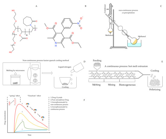 Chemical structures of drug and polymer (A) Soluplus®; (B) NIT. Preparation process (C) Schematic diagram of co-precipitation process; (D) Schematic diagram of fusion/quench cooling process; (E) Schematic diagram of hot melt extrusion progress. (F) Illustration of the spring-parachute process associated with saSMSDs made by continuous and non-continuous preparation processes and other control groups.