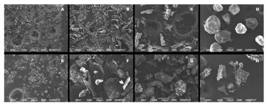 Analysis of scanning electron microscope on crystalline NIT ((A), 100×), crystalline NIT ((B), 200×), NITPM ((C), 200×), Soluplus® ((D), 200×), NITAM ((E), 200×), saSMSD/NITNCCP ((F), 200×), saSMSD/NITNCFQC ((G), 200×), saSMSD/NITCHME ((H), 200×).