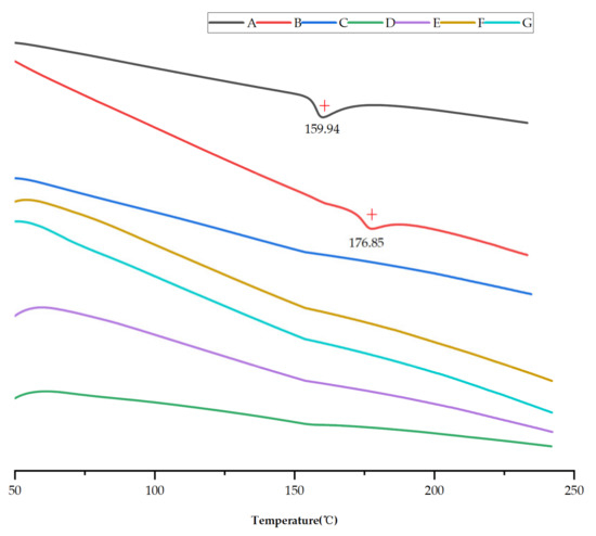 Another assessment tool, DSC curves, which can reflect the thermal behaviors of saSMSD/NIT systems and controls, can also provide detailed energy information to describe constituent drugs [47]. Thus, DSC analysis was conducted here to assess NIT phase transformation during the formation of saSMSD/NIT systems, crystalline NIT, and pure amorphous NIT (NITAM). Figure 3 shows DSC thermographs of various samples collected within the temperature range of 50 to 240 °C. Notably, an obvious endothermic inverted peak (i.e., melting point) appeared in the crystalline NIT sample at a temperature of about 159.94 °C. By contrast, no endothermic peaks were detected for amorphous self-micellizing Soluplus® (Figure 3C), while the physical mixture of NIT and polymer exhibited an endothermic inverted peak at 176.85 °C (Figure 3B). Sometimes melting point shifts are observed for physical mixtures (as compared to constituents) due to differential molecular miscibility within fused physical mixture solutions. However, pure amorphous NIT and saSMSD/NIT system curves lacked detectable melting point peaks, thus indicating that saSMSD/NITCHME, saSMSD/NITNCFQC, and saSMSD/NITNCCP were present in amorphous states regardless of whether they were fabricated using continuous or non-continuous processes.