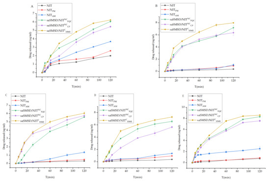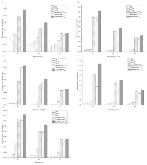 Dissolution rates calculated at 30, 60 and 120 min for NIT-related samples in 0.1 mol/L HCl (A); NIT-related samples in PBS (pH 4.5) (B); NIT-related samples in PBS (pH 6.8) (C); NIT-related samples in PBS (pH 7.5) (D); NIT-related samples in H2O (E). Standard deviations are expressed as error bars (n = 3).