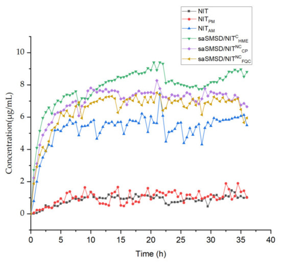 “Spring-parachute” profile of NIT-related samplesincluding NIT, NITPM, NITAM, saSMSD/NITNCFQC, saSMSD/NITNCCP, saSMSD/NITCHME during 36 h at the equivalence of 30 mg NIT in PBS (pH 6.8) using dissolution apparatus.