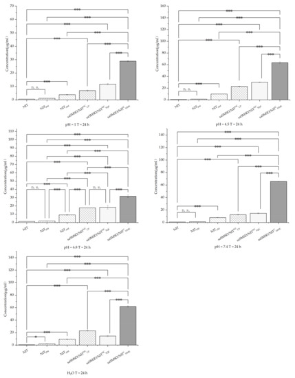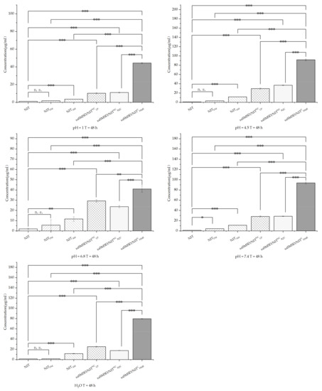 Solubility of samples in different solutions (H2O, 0.1 mol/L HCl and PBS (pH 4.5, 6.8, 7.5)) at 48 h; * p < 0.05, ** p < 0.01, *** p < 0.001, n. s., no significant difference. Standard deviation expressed by error bars (n = 3).