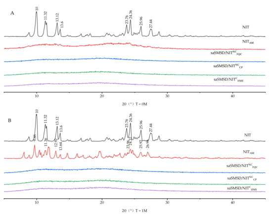 Stability Powder X-ray diffractogram of NIT, NITAM, saSMSD/NITNCFQC, saSMSD/NITNCCP, saSMSD/NITCHME at 0 month (A), 1 month (B).
