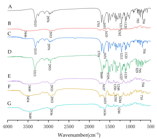 FTIR spectra of samples including NIT (A), Soluplus® (B), NITPM (C), NITAM (D), saSMSD/NITNCFQC (E), saSMSD/NITNCCP (F), saSMSD/NITCHME (G).