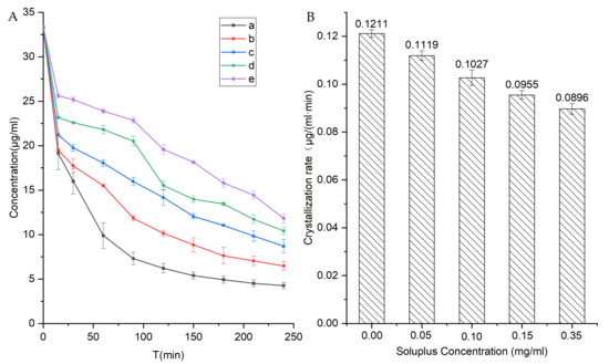 (A) Inhibition effects of Soluplus® on the recrystallization of NIT from a supersaturated concentrated solution (33.33 μg/mL) at 37 °C in PBS (pH 6.8) (a) and mixed with Soluplus® at different concentrations of 0.05 (b), 0.1 (c), 0.15 (d), or 0.35 mg/mL (e). (B) The relationship between crystallization rate and Soluplus® concentration. Standard deviations are expressed as error bars (n = 3).
