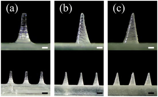 Effect of adjusting the 3D printing angle on the microneedle tip printing. Stereomicroscopic images of the microneedles at the different printing angles (a) 0°, (b) 45°, and (c) 60° to the x and y axes (n = 7; the upper and lower scale bars are 0.3 mm and 0.5 mm, respectively).