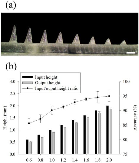 The change of the printed height of the microneedle according to the input height value was studied (Figure 2). The microneedle height was designed from 600 to 2000 µm at intervals of 200 µm, and the height of the printed microneedle was measured with a microscope (Figure 2a). The input height (computer dimension) and the output height (3D printed dimension) of the microneedle were measured, and the height difference was expressed as accuracy (%) (Figure 2b). The printed microneedle height was reduced by 101.5 ± 1.2 µm, and when the microneedle height was 600 µm, the output was reduced to at least 85.6 ± 1.7%. As the input height increased, the accuracy of the microneedle output increased, and the microneedle with an input height of 2000 µm was printed at an average of 95.0 ± 1.8%.