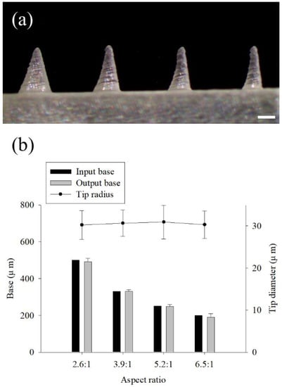 Effect of the aspect ratios of the microneedle on the 3D printing. Stereomicroscopic images of the microneedles with 1300 µm input height and 500 µm base at the aspect ratios of 2.6:1, 3.9:1, 5.2:1, and 6.5:1 (a). The dimensions of the input to output base and the tip diameter according to the aspect ratios (b) (n = 7, scale bar is 1.0 mm).