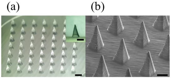 The transdermal drug delivery market is estimated to grow to approximately $95.77 billion by 2025 [1]. Microneedles, which compensate for oral administration and subcutaneous injection limitations, are attracting attention as an ideal transdermal drug delivery tool [2]. A microneedle 100 to 1500 µm in length can penetrate the stratum corneum without pain [3,4]. Moreover, since the drug is administered through the skin, the drug, which is difficult to deliver through the oral route of administration, can be efficiently delivered through the skin by avoiding the liver first-pass effect [5,6]. In general, a microneedle is fabricated precisely with resolutions of hundreds of nanometers by microelectromechanical system (MEMS) technology, including chemical wet etching, ion etching, and drawing lithography [7,8,9]. However, MEMS technology requires expensive equipment and has high maintenance costs, and the manufacturing method is complicated [10]. Therefore, it is essential to develop a technology that can economically and precisely manufacture microneedles, thereby lowering the entry barrier for microneedle research and revitalizing the development of microneedle pharmaceuticals and cosmetics.
