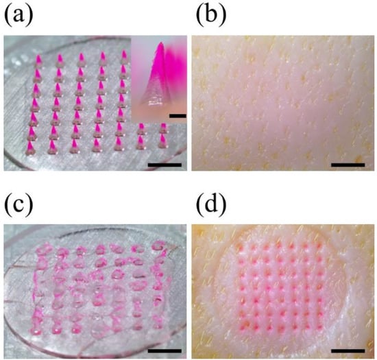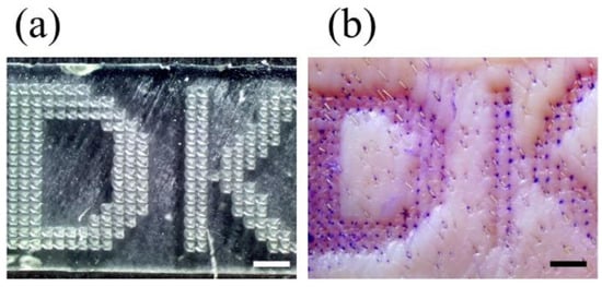 One of the 3D printing advantages is that it can print 3D objects in a customized arrangement [27]. To show that custom high-resolution arrays can be easily manufactured using an SLA 3D printer, we fabricated a letter type microneedle array (Figure 9). The skin penetration was confirmed by inserting a microneedle array in a DK letter into the porcine skin ex vivo (Figure 9a). As a result, the skin was stained according to the letter shape, and the skin penetration rate was about 98% (Figure 9b). Therefore, we proved through this study that the microneedle produced by 3D printing can be arranged in various ways to be applied not only for drug delivery but also to tattoo, text, barcode, or QR codes.