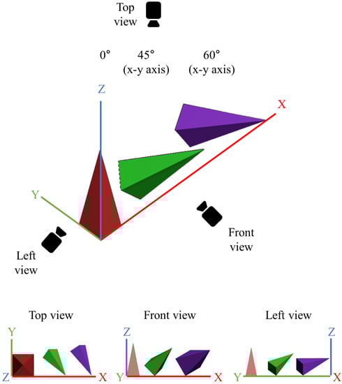 3D designs of the microneedles, which were rotated the printing angles at 0°, 45°, and 60° to both x and y axes with top, front, and left view.