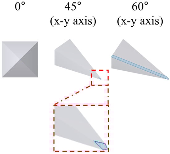 Schematic images of the single stacking layer area, including the microneedle tip at the printing angles 0°, 45°, and 60°, for both x and y axes.