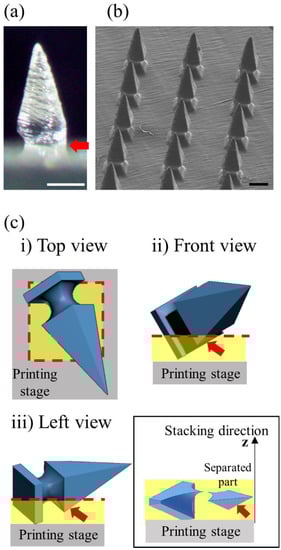 After tilting the x and y axes to 60°, the SNA microneedles were printed, and they measured the morphology with a stereomicroscope and SEM (Figure 8a,b). The arrowhead shape of the microneedle was precisely produced, but the one side of the notch (red arrow) was not accurately printed (Figure 8a). To analyze the printing results of the inaccurate parts (red arrow), the SNA microneedle design was tilted by 60° in the x and y axes, respectively, and divided the design into a single stacking layer using the slicing program (Figure 8c). The stacking direction of the printing proceeds to the z-axis direction from the printing stage. When the single stacking layers of the SNA microneedles were analyzed, it was found that a part of the SNA microneedle (red arrow) was separated from the microneedle body and printed (Figure 8c inset). Since this separated part has no supporting part under it, the part falls off from the microneedle even if it is printed. Therefore, it is confirmed that one side of the notch is challenging to print correctly. However, the entire SNA microneedle array and tip structure were accurately printed, and the notches on the remaining sides were printed (Figure 8b). Consequently, this study proved that high-dimensional microstructures can be printed with an improved resolution by varying the printing angle.