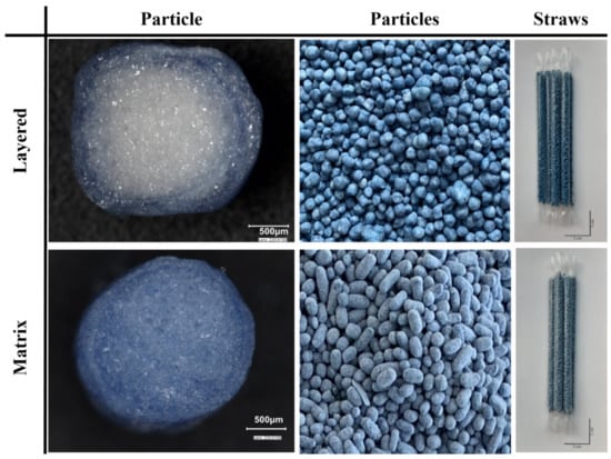 The pellets were successfully loaded into straws. Photographs of the filled straws are shown in Figure 2. As the HR value of the produced particles is below 1.11 [24], the matrix and layered particles both had excellent flow properties, predicting the fast filling process of the empty straws.
