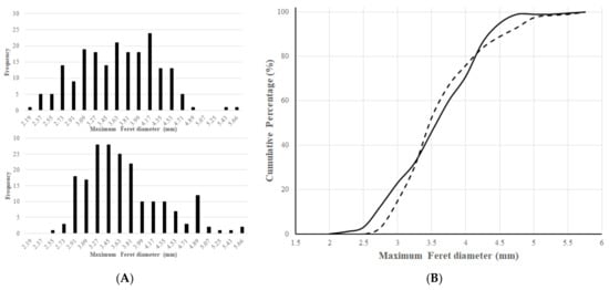 The PSD of the two different particles were calculated and presented in Figure 3. The results show that both particles have a unimodal distribution. The distribution of the matrix system is between the range of 2–4 mm (Figure 3A), while the layered particles give a sharper peak at 3 mm (Figure 3B). From this, it also can be seen that our particles were larger than a conventional pellet, but this property only facilitated their suitability for being loaded into and for being retained in the straws.