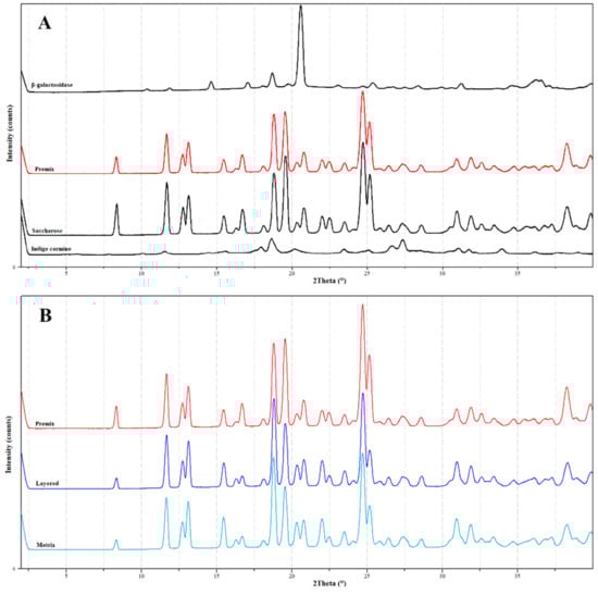 XRD profiles of the used materials (A) (β-galactosidase, saccharose and indigo carmine in black), (B) premixed powder (red), powdered layered particles (blue) and powdered matrix particles (light blue).