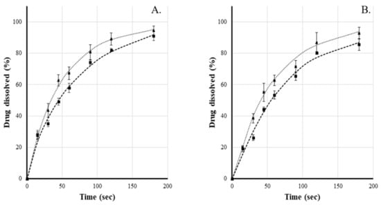 Comparing the particulates produced by the two methods, it can be concluded that the layered structured particulates being more spherical (roundness = 0.83), flowed better at 23.69 g/s and achieved a slightly lower Hausner Ratio of 1.045 compared to the matrix structured particulates. The latter, while being considerably less spherical (roundness = 0.71) still flowed exceptionally well (flow rate of 20.45 g/s) and their compressibility was at almost the same rate as the layered pellets’ (Hausner Ratio of 1.047). Both types of investigated samples were larger than a typical pharmaceutical pellet with Feret diameters of about 3.6 and 3.5 mm, while their projected area was about 8.0 and 6.6 mm2, respectively. However, these dimensions were deemed acceptable to load the particulates into plastic drinking straws, and for the particulates to remain inside those straws while the dissolution tests were carried out. Both types disintegrated in less than 3 min. The disintegration of the particles within 3 min was important because this time interval is also determined by the European Pharmacopoeia as the maximum acceptable disintegration time of orodisperse tablets [29].