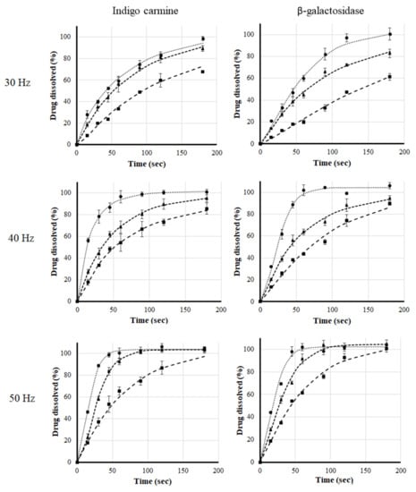 Indigo carmine (1st column) and β-galactosidase (2nd column) release profile (●; ■; ▲; n = 3 ± SD) with fitted Weibull function (dotted lines). The pump frequencies are 30 Hz; 40 Hz or 50 Hz, and the fluid exhibiting different temperatures: 5 °C (■); 20 °C (▲) and 35 °C (●) during the simulation.