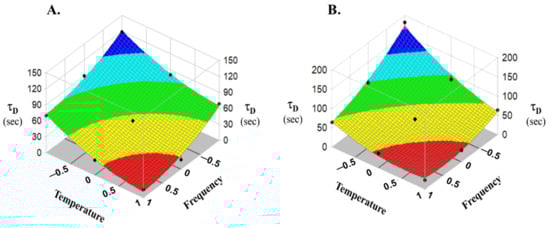 For both indigo carmine and lactase, the sign of the main effect of the two independent variables is negative. Meaning that, increasing both the temperature of the liquid and the value of the pump frequency decreases the value of τd, thus, it can be characterized by a faster release profile, but the effects are independent of each other. The magnitude of the values of these coefficients (b1 and b2) is similar. The combined effect of the two independent variables is only valid for lactase, as the interaction parameters indicate (b12). The resultant equations (Equations (3) and (4)) represent the significant effect independent variables have on the τd time parameter.