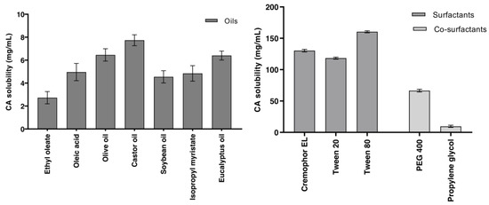 As previously stated, the solubility of CA molecules in various components of SNEDDS—such as oils, surfactants and co-surfactants—is the primary criterion for their selection (Figure 1). The increased solubility of the drug in the oil phase was essential to maintain the drug in the solubilized state and prevent drug precipitation in the gut lumen during dilution. Higher drug solubility in oil means less oil in the formulation, which means that less of the surfactants and co-surfactants are needed to emulsify drug-loaded oil droplets [30]. Figure 1 shows that CA solubility in different excipients. Among the various oils, castor oil (7.74 ± 0.47 mg/mL) had the highest CA solubility. In the surfactant screening, nonionic surfactant was considered over ionic surfactant for oral administration [33]. In addition, it can also be helpful in the preparation of a stable nanoemulsion over a range of pH and ionic strengths, and it improves the intestinal absorption of the loaded drug [34]. Among the screening surfactants, Tween 80 and Cremophor EL, which had the highest CA solubilization capacity (160.33 ± 1.53 mg/mL and 130.52 ± 2.08 mg/mL, respectively), were chosen for further evaluations. The addition of the co-surfactant in the SNEDDS component increases the nanoemulsion region, and hence the emulsification efficiency. PEG 400 was selected as a co-surfactant due to its higher CA solubility (66.58 ± 2.12 mg/mL).