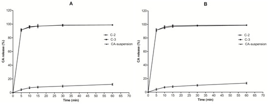 An in vitro release study was performed in order to compare the CA (%) release from the developed SNEDDS formulations (C2 and C3) and the CA suspension (containing the same amount of the drug). The release profile depicts the two-step process for SNEDDS, as shown in Figure 3A,B. The burst release phase, which can be attributed to the surface-associated drugs, was followed by a slower sustained release phase. The latter phase could be due to the diffusion-controlled dissolution of CA from the globules [37]. Other reasons for the burst release from the SNEDDS could be the smaller mean DS of both the formulation (the 21.23 ± 1.90 nm and 18.50 ± 1.83 nm sizes of C2 and C3, respectively) and ultimately the higher surface area, which permitted burst release. However, the initial CA release from the CA-suspension was found to be much slower than the optimized formulations C2 and C3. It was also found that optimized SNEDDS substantially enhanced the CA release, as more than 90% of the CA was released in the first 10 min of the study, compared to less than 5% from the CA suspension.