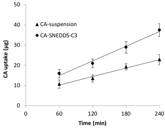In conclusion, CA-loaded liquid SNEDDS were successfully developed using the aqueous titration method. The obtained results showed that the prepared SNEDDS was thermodynamically stable, with good self-emulsification efficiency and a globule size in the nanometric range, indicating that it may be physiologically stable. The selected CA-SNEDDS-C3 showed a higher dissolution rate than free CA (CA suspension). Human intestinal Caco-2 cells uptake CA much better in SNEDDS than in suspension, indicating that the lipid solubility of CA is higher and the rate of diffusion through cells is faster when it is formulated in SNEDDS. Our findings suggest that CA-SNEDDS could be considered a potential alternative for oral delivery. To summarize, it is a novel and commercially feasible alternative to the currently marketed CA products.