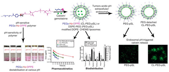 - Chiang, Y.T.; Lo, C.L. pH-responsive polymer-liposomes for intracellular drug delivery and tumor extracellular matrix switched-on targeted cancer therapy. Biomaterials 2014, 35, 5414–5424. [Google Scholar] [CrossRef] [PubMed]