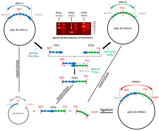 The genetic construct for rPA83m was generated using pQE-30-rPA1+2 and a previously obtained rPA3+4 expression vector (pQE-30-rPA3+4) [15] as templates. During the first stage, two DNA fragments corresponding to 3′-fragment of rPA1+2 gene (PCR1) and to 5′-fragment of rPA3+4 gene (PCR2) were obtained using primers presented in Table 1. PCR2 also contained 20 nucleotides, which were specific to the 3′-end of the rPA1+2-coding sequence. At the second stage, overlap PCR with PCR1 and PCR2 was conducted, and SphIFwd and PstIRev flanking primers were used for amplifying the fusion product (PCR3). PCR3 was digested with SphI and PstI. The 3′-fragment of the rPA3+4 gene was obtained by restricting the pQE-30-rPA3+4 vector with PstI and HindIII. The pQE-30-rPA1+2 vector digested with SphI and HindIII was employed for the one-step cloning of PCR3 and the 3′-fragment of rPA3+4. The resulting construct was named pQE-30-rPA83m. A graphical overview of the generation of the rPA83m expression vector is presented in Figure 1.