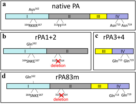 Graphical overview of modified recombinant anthrax antigens rPA1+2 (b), rPA3+4 (c) and rPA83m (d) compared with native PA (a). rPA1+2 contains PA domains I and II with mutations at furin and chymotrypsin cleavage sites (the 162NSRKKR167 fragment was replaced by 162QSSNKE167 at the furin proteolysis site and the 313FF314 fragment was deleted at the chymotrypsin proteolysis site). rPA3+4 contains PA domains III and IV with deamidation-prone Asn713 and Asn719 residues both replaced with Gln. rPA83m is a full-size modified recombinant PA with all modifications implemented in rPA1+2 and rPA3+4.