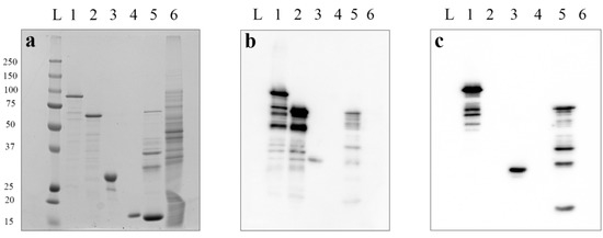 Interaction of obtained anthrax modified recombinant antigens with a polyclonal anti-rPA83 antiserum (b) and chimeric monoclonal PA-neutralising antibodies (c). L—protein molecular weight markers ladder (molecular weights, in kDa, are indicated on the left), 1—rPA83m, 2—rPA1+2, 3—rPA3+4, 4—Tobacco mosaic virus, 5—rPA63, 6—E. coli cell lysate. Electrophoresis analysis in 8–20% SDS-PAGE, staining by Coomassie G-250 (a). Western blot analysis with primary polyclonal antiserum to the non-modified rPA83 (1:5000) (b) or chimeric monoclonal PA-neutralising antibodies (1:5000) (c) and secondary HRP-conjugated antibodies (1:10,000). Original blot membranes’ images are presented in the Figure S1.