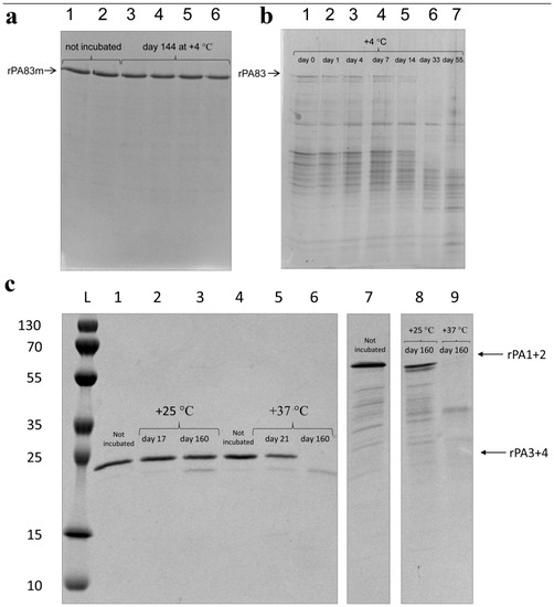 The stability of rPA83m (a), non-modified rPA83 (b), rPA3+4 and rPA1+2 (c); (a)—1, 2—rPA83m not exposed to incubation. 3–6—four independent replicates of a rPA83m sample incubated at +4 °C for 144 days. (b)—1—non-modified rPA83 not exposed to incubation, 2–7—non-modified rPA83 incubated at +4 °C for 1, 4, 7, 14, 33 and 55 days, respectively. (c)—L—protein molecular weight markers ladder (molecular weights, in kDa, are indicated on the left). 1, 4—rPA3+4 not exposed to incubation. 2, 3—rPA3+4 incubated at +25 °C for 17 and 160 days, respectively. 5, 6—rPA3+4 incubated at +37 °C for 21 and 160 days, respectively. 7—rPA1+2 not exposed to incubation. 8—rPA1+2 incubated at +25 °C for 160 days. 9—rPA1+2 incubated at +37 °C for 160 days. Original gels are presented in the Figure S2.