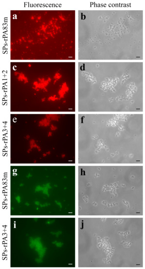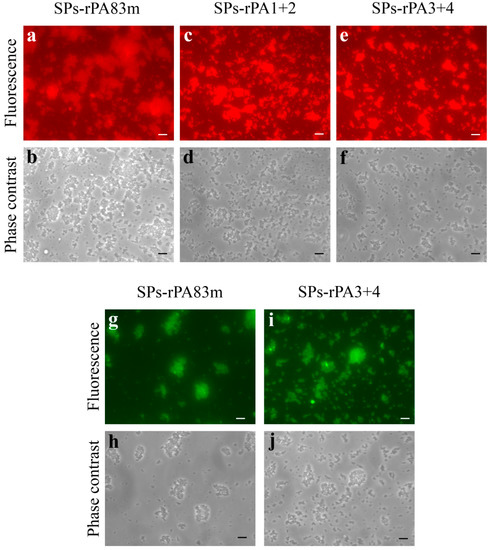 Compositions of SPs with anthrax modified recombinant antigens. Immunofluorescence analysis of SPs-rPA83m (a,b,g,h), SPs-rPA1+2 (c,d) and SPs-rPA3+4 (e,f,i,j) compositions. (a,b), (c,d), (e,f), (g,h), (i,j) in pairs are the same images presented in fluorescence and phase contrast modes, respectively. The SPs-protein compositions were treated with polyclonal antiserum to rPA83m (a,b), to rPA1+2 (c,d) or to rPA3+4 (e,f) or with chimeric monoclonal PA-neutralising antibodies (g–j) and secondary antibodies conjugated to Alexa Fluor® 546 (a–f) or to CF™ 488A (g–j). Scale bars, 5 μm. SPs/antigen mass ratio within compositions is 10/1. Compositions were obtained in 1× PBS. Images of corresponding negative control samples (not incubated with primary antibodies) are presented in the Figure S3a–j, respectively. Images of SPs-rPA1+2 compositions treated with chimeric monoclonal PA-neutralising antibodies and secondary antibodies conjugated to CF™ 488A as a negative control represented in Figure S3k,l (k—fluorescence analysis, l—phase contrast).