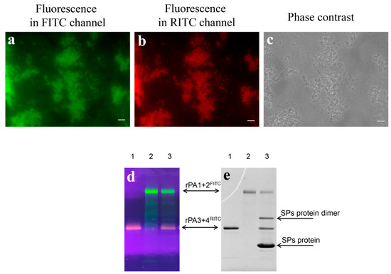 In order to examine the possibility of simultaneous adsorption, rPA1+2 and rPA3+4 were labelled with fluorescein isothiocyanate (FITC) or rhodamine isothiocyanate (RITC), respectively and analysed by both fluorescence and SDS-PAGE analysis (Figure 6, Figures S4 and S5). The resulting labelled proteins were named rPA1+2FITC (Figure 6d,e, lane 2) and rPA3+4RITC (Figure 6d,e, lane 1). Compositions of SPs with both rPA1+2FITC and rPA3+4RITC (Figure 6d,e, lane 3) were obtained in PBS with the following mass ratio of the respective ingredients: 20/1/1, which corresponded to 10/1 of the SPs/total antigen ratio. Pictures obtained using fluorescence imaging mode in FITC (Figure 6a) and RITC (Figure 6b) channels and phase contrast imaging mode (Figure 6c) demonstrated that particles’ outlines in all three images totally correlated. Therefore, rPA1+2 and rPA3+4 were shown to be able to simultaneously cover the surface of SPs.
