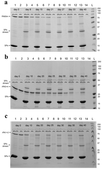 Comparative stability of SPs-antigen compositions and individual antigens at +37 °C for rPA83m (a), rPA3+4 (b) and rPA1+2 (c). (a)—1, 3, 5, 7, 9, 11, 13—rPA83m within SPs-rPA83m compositions incubated at +37 °C for 0, 9, 15, 21, 27, 33 and 40 days, respectively. 2, 4, 6, 8, 10, 12, 14—Individual rPA83m incubated at +37 °C for 0, 9, 15, 21, 27, 33 and 40 days, respectively. L—Protein molecular weight markers ladder (molecular weights, in kDa, are indicated on the right). (b)—1, 3, 5, 7, 9, 11, 13—rPA3+4 within SPs-rPA3+4 compositions incubated at +37 °C for 0, 10, 20, 25, 30, 35 and 40 days, respectively. 2, 4, 6, 8, 10, 12, 14—Individual rPA3+4 incubated at +37 °C for 0, 10, 20, 25, 30, 35 and 40 days, respectively. L—Protein molecular weight markers ladder (molecular weights, in kDa, are indicated on the right). (c)—1, 3, 5, 7, 9, 11, 13—rPA1+2 within SPs-rPA1+2 compositions incubated at +37 °C for 0, 10, 20, 25, 30, 35 and 40 days, respectively. 2, 4, 6, 8, 10, 12, 14—Individual rPA1+2 incubated at +37 °C for 0, 10, 20, 25, 30, 35 and 40 days, respectively. L—Protein molecular weight markers ladder (molecular weights, in kDa, are indicated on the right). Relative analysis of recombinant proteins degradation rate is presented in Table A1.