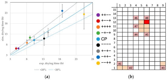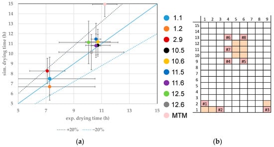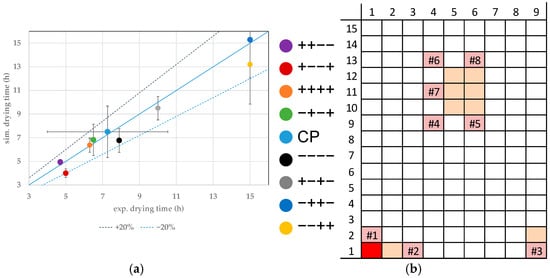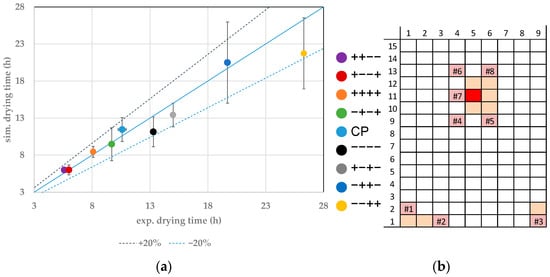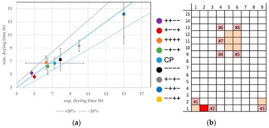 (a) Parity plot between simulated and experimental primary drying endpoints for distinct vials at the CP. (b) Color legend and vial position (orange: probed vials, pink: WTMplus sensor position and WTMplus number).