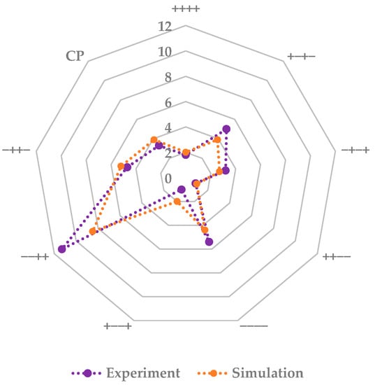To access the interaction and strength of different process parameters for simulation and experiment, pareto plots are used. Pareto plots define statistically relevant process parameters on the performance and their direction. They are shown in Figure 11. Both the experiment and the simulation show the same significant parameters, fill volume and shelf temperature. Fill volume correlates positively with the primary drying duration, while an increase in shelf temperature leads to a reduction. This is consistent with the previously elaborated statements. ++−− and +−−+ show the fastest drying, while −−++ and −++− have the slowest drying.