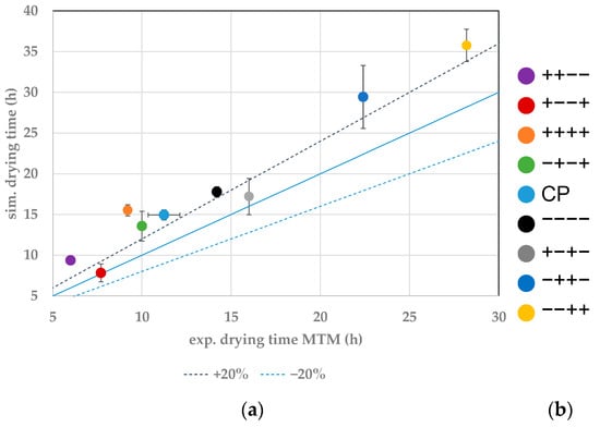 (a) Parity plot between simulated and experimental primary drying endpoints of MTM. (b) Color legend.