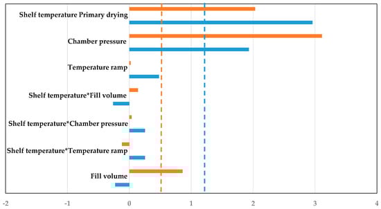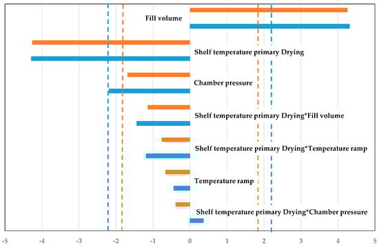 Pareto diagram of standardized effects for primary drying duration (blue: Experiment; orange: Simulation, dashed line: significance threshold).