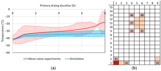 (a) Product temperature profile of vial 1.1 during primary drying at ++−−. (b) Vial position (red: shown vial, orange: other probed vials, pink: WTMplus sensor position and WTMplus number).