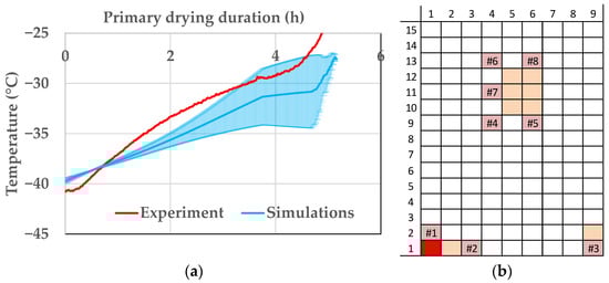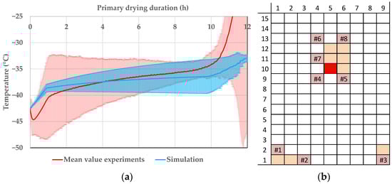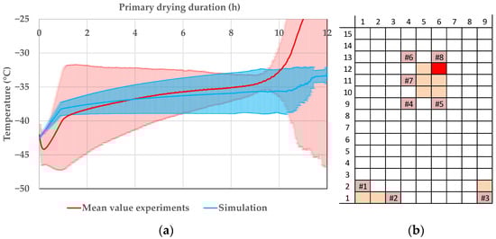 In Figure 12, the product temperature profiles of vial 1.1 can be seen. The experiments are shown in red and the simulations in blue. In the beginning, simulated and experimental data are in good agreement, but with ongoing primary drying the data drift apart. Vial 1.1 is an edge vial and the additional radiative heat transport leads to big deviations in the product temperature. For the edge vials, the modelling approach shows a good precision, but the accuracy is lacking. At around 7.5 h, the mean value of the primary drying endpoint is reached; therefore, the experimental temperature shows a smaller deviation.