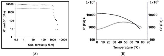(A,B) Storage modulus (G′, solid shapes) and loss modulus (G″, empty shapes) of the hydrogel system samples (n = 3), deduced from both oscillatory stress sweep experiments at 25 °C, 10 (μN·m), and 1 Hz frequency, (rheogram (A)); and a temperature sweep experiment, carried out at temperature rate of 1 degree/min and 1 Hz frequency, (rheogram (B)).