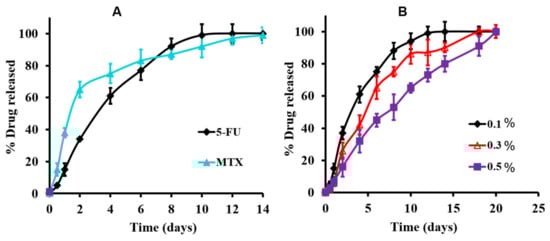 In vitro release profiles of the individual 5-FU and MTX from the modified hydrogel at 37 °C in PBS at 0.1% drug concentration (A), and the release profile of 5-FU as a function of drug concentration in PBS at 37 °C (B).